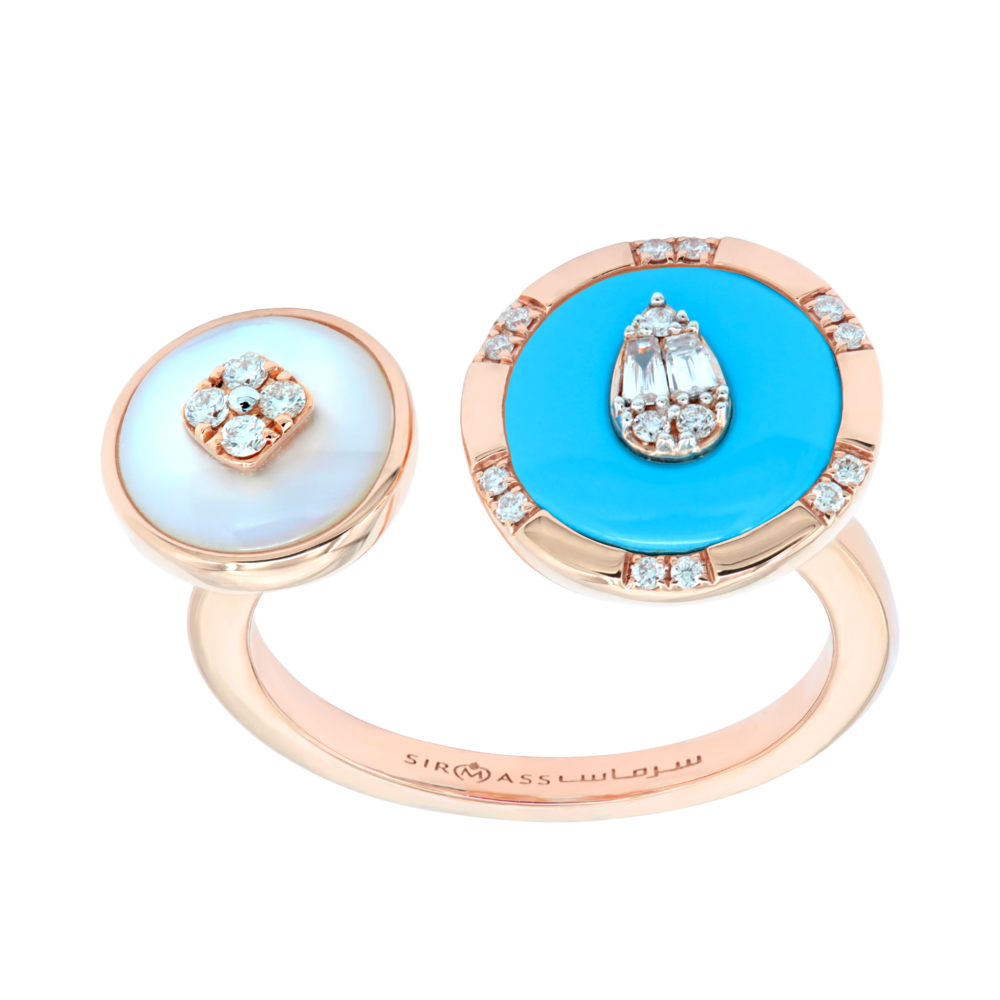 خاتم من الذهب الوردي عيار 18 قيراطاً مرصعة بالألماس و الفيروز و الصدف